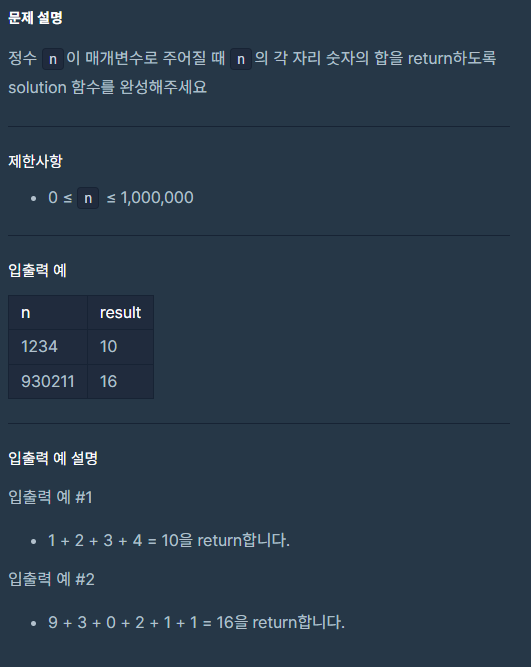 [코딩테스트]프로그래머스 java 자릿수 더하기 본문